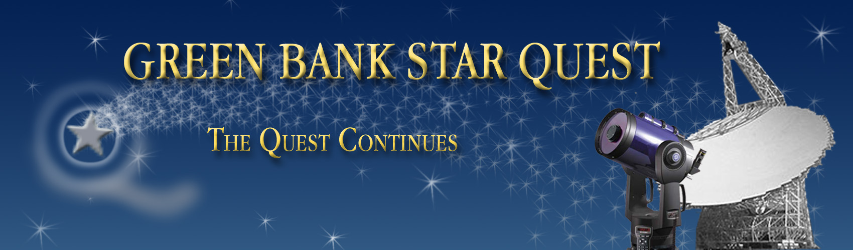 ~~~~~~~~~~~~~~~~~~~~~~~~~~~~~~~~~~~~~~~~~~~~~~~~~~~~~~~~~~~~~~~~~~~~~~~~~~~~~~~ Star Quest XIII for 2016 is over. Thanks to all who attended, to all our supporters, the vendors, to everyone who donated to our raffle, and to all the club members who worked so hard to make this a great event! We would also like to give a special Thank You to the staff of the Green Bank National Radio Observatory, for their wonderful support and assistance in this event. We are now working on Star Quest for 2017 (see details below). We are now in the process of accepting inquiries from and suggestions for speakers and instructors for the 2017 event. (see contact us page) ~~~~~~~~~~~~~~~~~~~~~~~~~~~~~~~~~~~~~~~~~~~~~~~~~~~~~~~~~~~~~~~~~~~~~~~~~~~~~~~ Our 14th annual OPTICAL and RADIO astronomy "Star Party" July 19th - 22th, 2017 held at the National Radio Astronomy Observatory at Green Bank, WV. We will have a distinguished keynote speakers EVERY evening, with presentations on the latest in optical & radio astronomy. We will have a featured prominent speaker for the "Keynote Presentation" Saturday evening. Clinics and additional presentations held daily (indoors) on multiple subjects including Astrophotography. Solar and night-time observing at your campsite. Campground has graveled roads, sanitary stations and a HOT shower facility (close by). We Feature: a Large Raffle Drawing, Children's Activities, Cafeteria and Snack Bar, and Vendors on site. The 4-day registration fee is just $100. Limited bunkhouse accommodations for additional fee. For additional info see the other pages of this web site. Registration Link (click here) Please stay tuned, more information will be posted as it becomes available. |